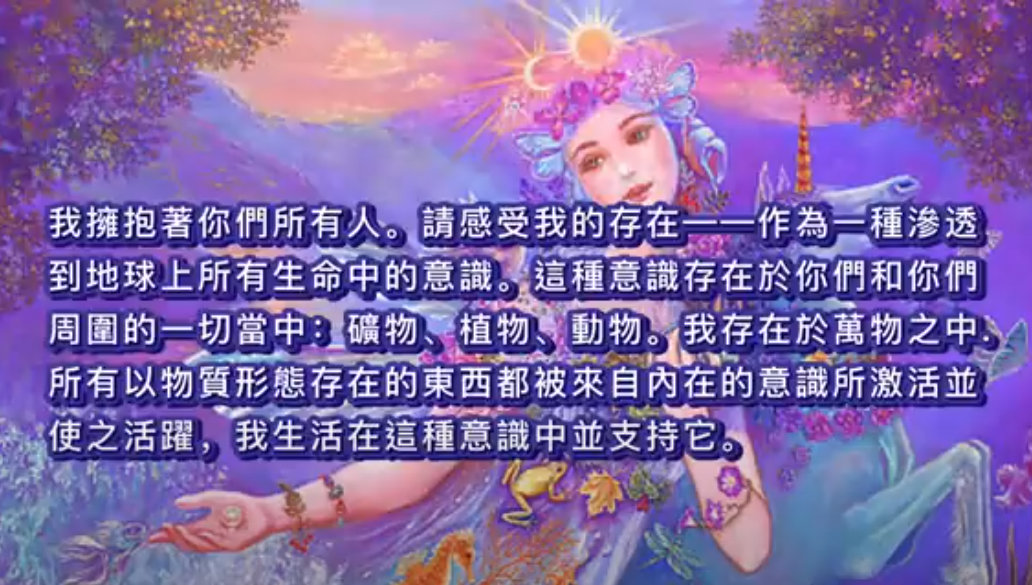 世界正移向一个新的更高的合一意识中,盖娅不能被丢下。那些选择在森林里或马路边丢垃圾的人,或是往地上和水里倾倒化学物质的人,没有意识到他们是在对自己、自己的家人、朋友和孩子做这样的事情。盖娅是一个活生生的灵魂,必须被每一个寻求灵性进化的人灵性的对待。