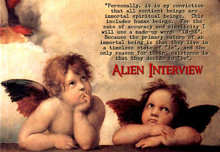 “不,我不会去回答问题了,我将提供给你一些信息,会使构成人类社会的这些不朽的精神生命在幸福方面收益,而且将有利于扶植地球上无数的生物形式和生态环境,正如这也是我使命的一部分,以确保地球得到保管。就我个人而言,我深信所有的意识生物都是不朽的精神生命,这其中包括人类。