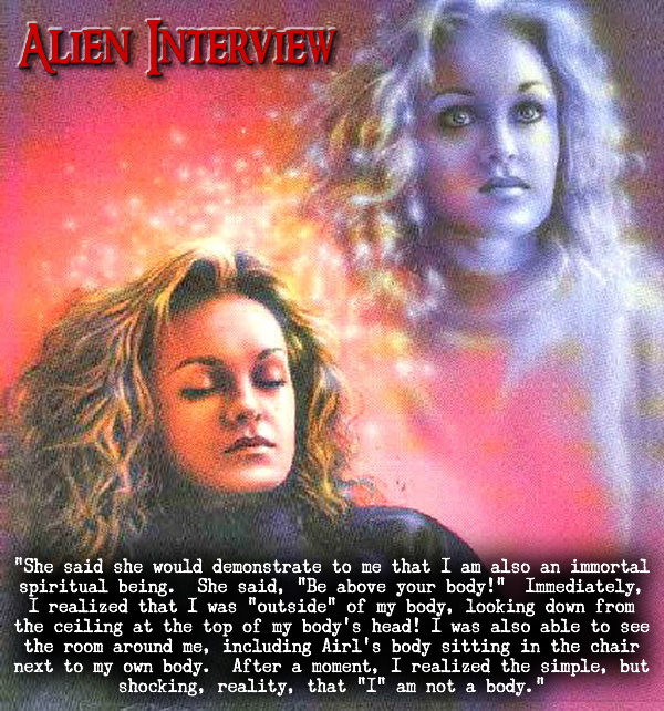 艾罗说她感觉到我对她的想法有些困惑,她说她会向我证实我也是一个不朽的精神生命,接着她说,“到身体的上方来!”与此同时,我开始意识到我已经处在身体的“外部”了,而且正在从我的头上方天花板的位置朝下面看!我还能看到我身体周围房间内部的景象,包括坐在我身体旁边的艾罗的身体。过了一会儿,我认识到这个自然而又震撼的事实——“我”并不是一个实体。